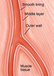 An artery is a muscular tube that carries oxygen rich blood and nutrients from the heart to the rest of the body. It has a smooth lining and flexible walls that allow blood to pass freely. When active, muscles need more oxygen. This increases blood flow. Healthy arteries can adapt to meet this need.