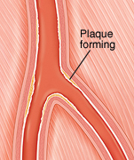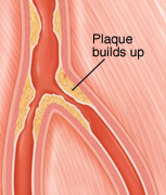 Peripheral arteries deliver oxygen-rich blood to the tissues outside the heart. As you age, your arteries become stiffer and thicker. Things such as smoking and high cholesterol can also damage the artery lining. This allows a buildup of fat and other materials (plaque) to form within the artery walls. The buildup of plaque narrows the space inside the artery and sometimes blocks blood flow. Peripheral arterial disease (PAD) happens when blood flow through the arteries is reduced because of plaque buildup. It often happens in the legs and feet. But it can also happen elsewhere in the body. It can lead to stroke if this buildup happens in the large artery in the neck (carotid artery).